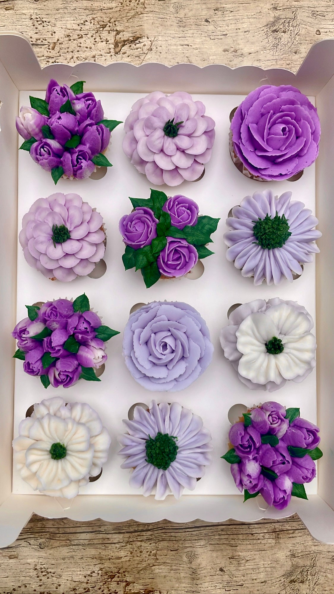 Cajita con 6 o 12 deliciosos cupcakes decorados en forma de flores hechas a mano en tonos morados y lilas realizadas con nuestro característico buttercream de queso crema.