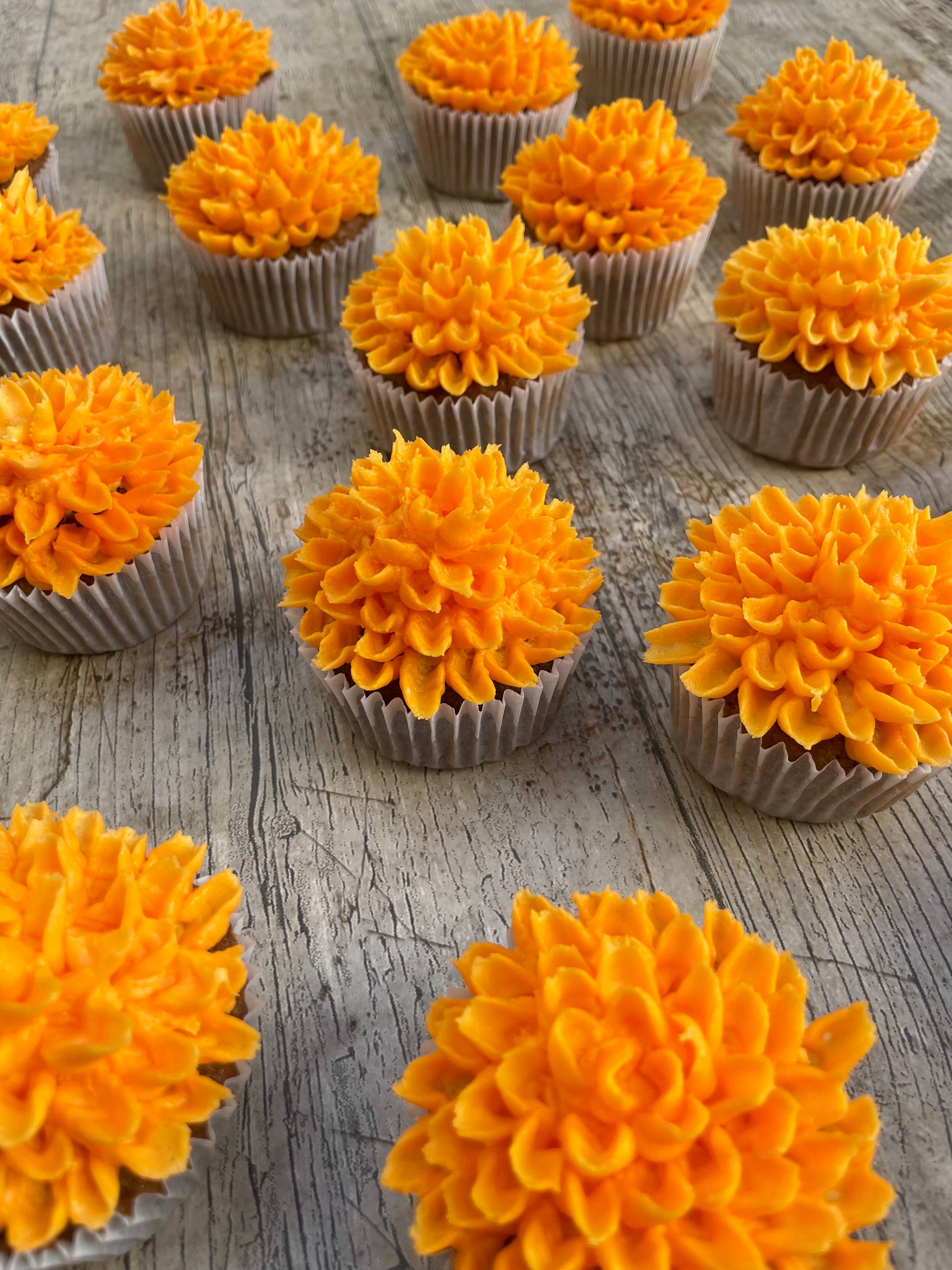 Cajita con 6 o 12 deliciosos cupcakes decorados en forma de flores de cempasúchil hechos a mano con nuestro característico buttercream de queso crema.