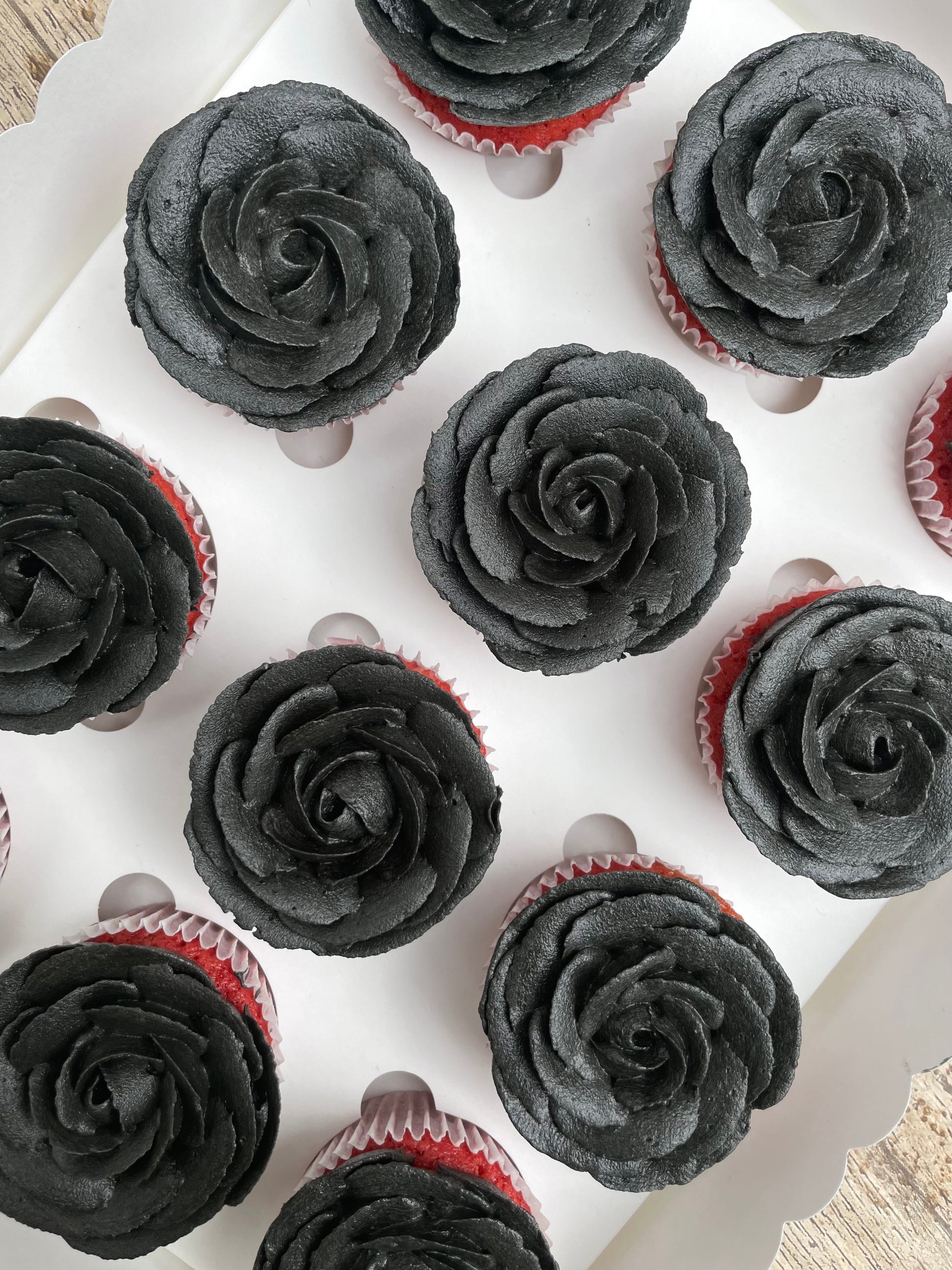 Cajita con 6 o 12 deliciosos cupcakes decorados en forma de rosas negras hechos a mano con nuestro característico buttercream de queso crema.