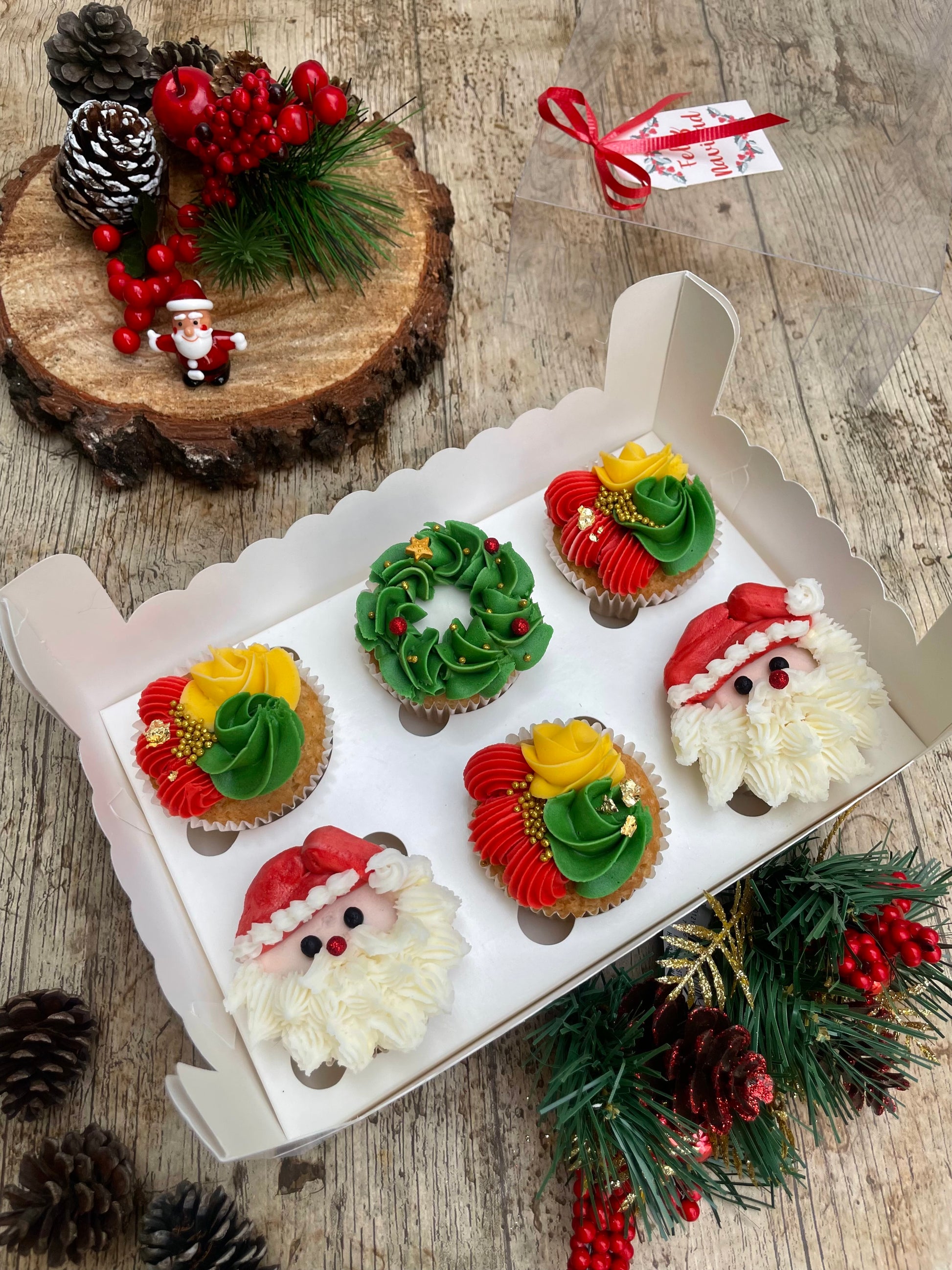 Cajita con 6 o 12 deliciosos cupcakes decorados con nuestro característico buttercream de queso crema en colores navideños, una corona navideña y unos hermosos Santa hecho a mano con el mismo buttercream. Incluye perlas de azúcar doradas y hoja de oro comestible